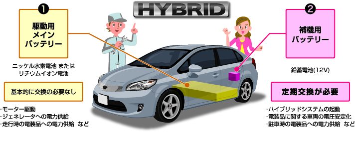 ハイブリッド車には2種類のバッテリーが搭載されています。